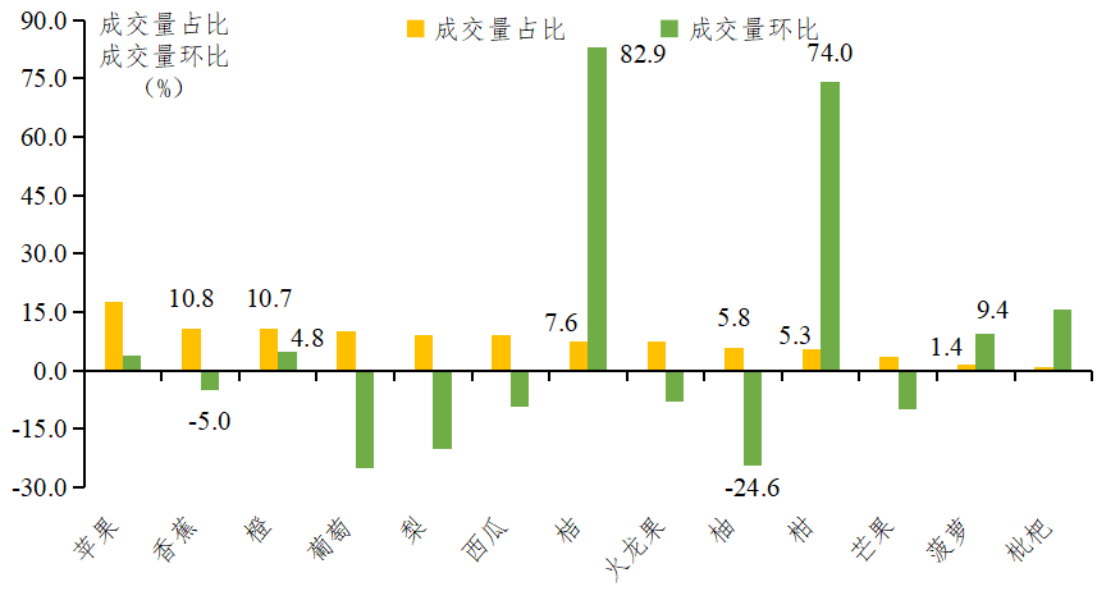 批发市场水果成交量下降。据省农业信息监测体系数据,省内批发市场水果总成交量环比下降1.4%,主要批发市场成交量排名前三的是苹果、香蕉、橙,占比分别为17.7%、10.8%和10.7%;成交量环比增幅前三的水果是桔、柑、枇杷,环比分别增加82.9%、74.0%和15.8%;成交量环比降幅较大的是葡萄、柚、梨,环比分别下降25.0%、24.6%和20.2%。