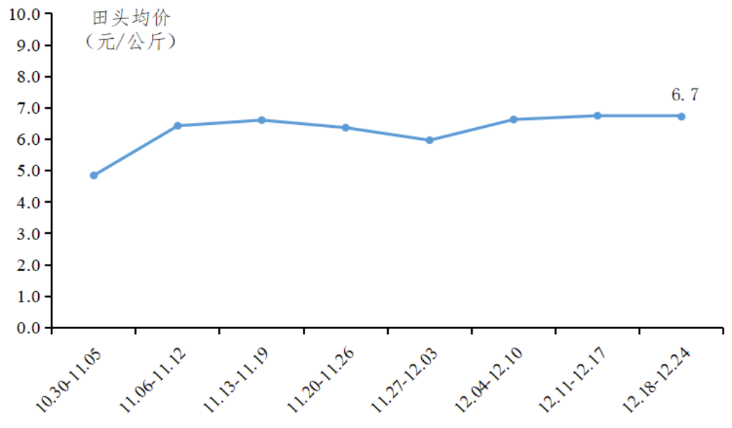 沙田柚田头行情环比微降。据省农业信息监测体系数据,12月沙田柚销售顺畅,行情平稳,田头均价稳定在6.0-6.8元/公斤,规模化基地沙田柚田头均价为6.7元/公斤,环比微降1.3%。