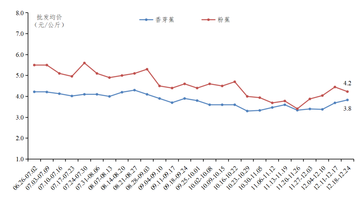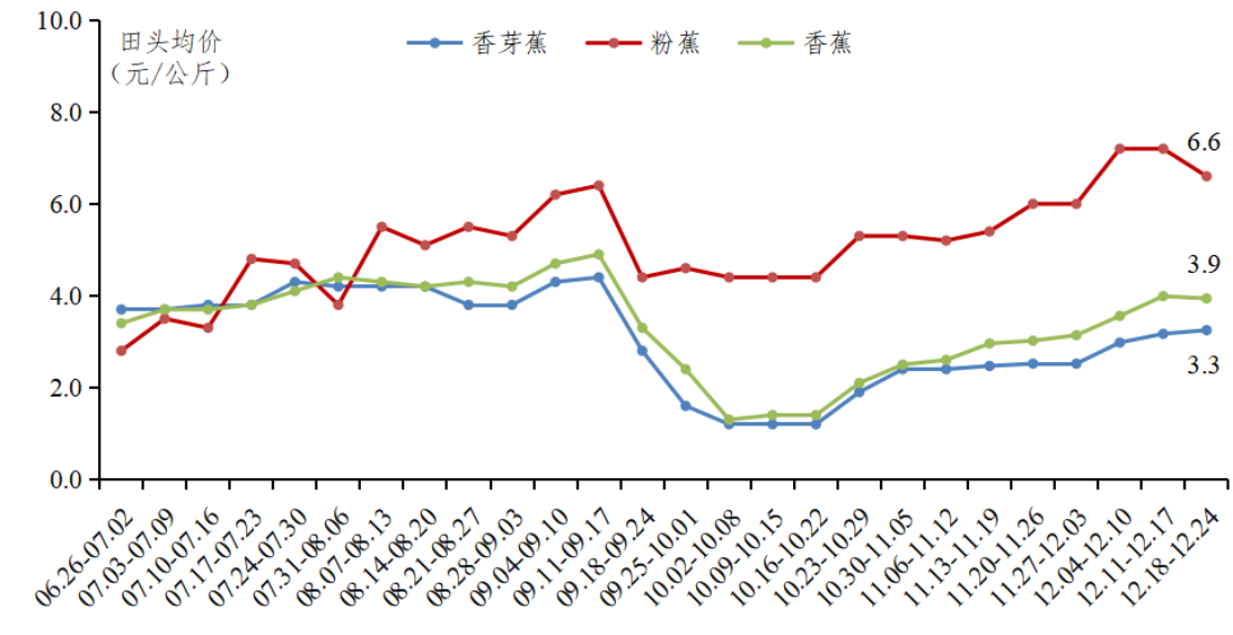 香蕉田头行情持续上涨。12月香蕉供应仍处于偏紧阶段,加之元旦临近,客商补货积极,需求量增加,带动行情上涨。据省农业信息监测体系数据,本月规模化示范基地香蕉均价为3.6元/公斤,其中香芽蕉田头均价为3.0元/公斤,环比上涨21.9%,粉蕉田头均价为6.7元/公斤,环比上涨23.3%。