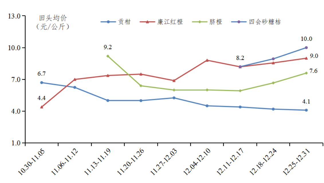 柑橘大量上市,行情下降。广东各产区柑橘大量上市,田头行情下降。据省农业信息监测体系数据,全省规模化柑橘基地柑橘田头均价为6.3元/公斤,环比下降18.6%。其中,贡柑田头均价为4.7元/公斤,环比下降21.5%;廉江红橙田头均价为8.2元/公斤,环比上涨18.3%;脐橙田头均价为6.0元/公斤,环比下降28.7%。12月12日四会砂糖桔正式进入采摘上市期,四会规模化基地砂糖桔上市价格为8.5元/公斤,与去年同期持平。