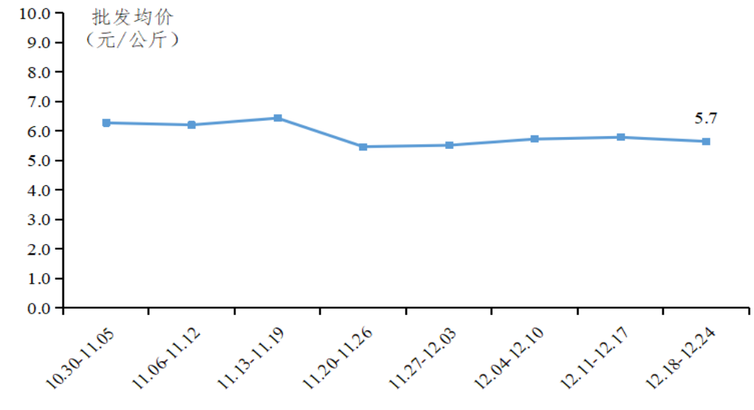 香蕉总体供应量仍偏少。12月香蕉供应产区以惠州、肇庆等地为主,阳江地区月初基本清园,香蕉总体供应量偏紧。进口方面,据海关总署统计数据,1-11月我省香蕉进口额为5627.0万美元,同比下降31.7%;出口额为144.8万美元,同比下降9.8%。