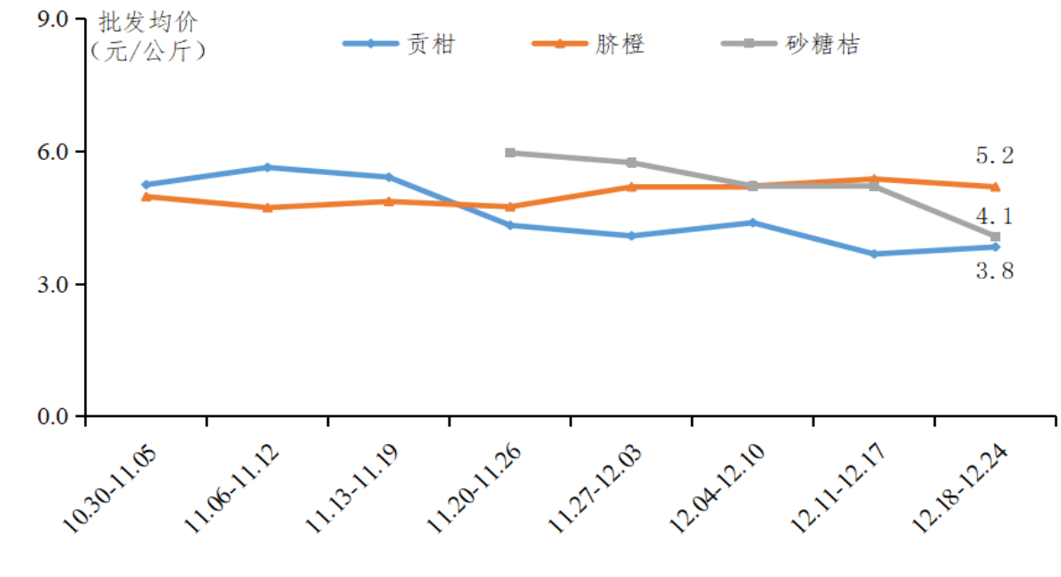 批发市场水果总入场量环比下降2.0%。12月省外应季水果供应减少,省内柑橘和柚类水果正值上市高峰期,省内水果供应量增加。据省农业信息监测体系数据,本月省内批发市场主要监测品种水果总入场量环比下降2.0%,省内入场量环比增加5.7%,省外入场量环比下降6.4%。其中香蕉入场量环比下降8.2%,省内入场量环比下降10.1%,省外入场量环比增加17.3%;柚入场量环比下降18.2%,省内入场量环比增加1.4%,省外入场量环比下降45.1%;柑橘入场量环比增加58.2%,省内入场量环比增加241.9%,省外入场量环比增加36.8%。