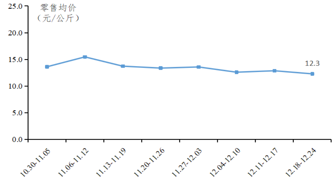 柑橘大量上市,市场供应充足。12月省内柑橘大量上市,德庆贡柑、仁化贡柑、廉江红橙和平远脐橙几大品类柑橘产区月末已进入出货尾期。据省农业信息监测体系数据,贡柑上市进度约8成;廉江红橙上市进度约7.5成;平远脐橙上市进度约8成;四会规模化砂糖桔种植基地从12月中旬起陆续开园,目前上市进度约2.5成,2021年四会砂糖桔预计产量为8.0万吨。