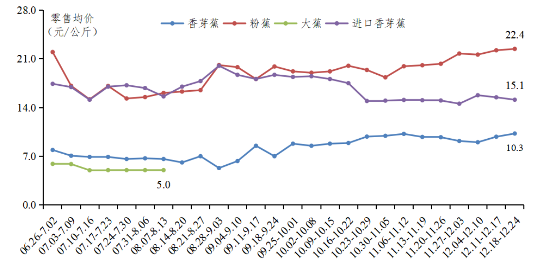 香蕉零售均价上涨。据省农业信息监测体系数据,主要零售平台香芽蕉、粉蕉、进口香芽蕉零售均价分别为12.4元/公斤、22.0元/公斤、15.4元/公斤;环比分别上涨24.0%、11.7%、1.9%。