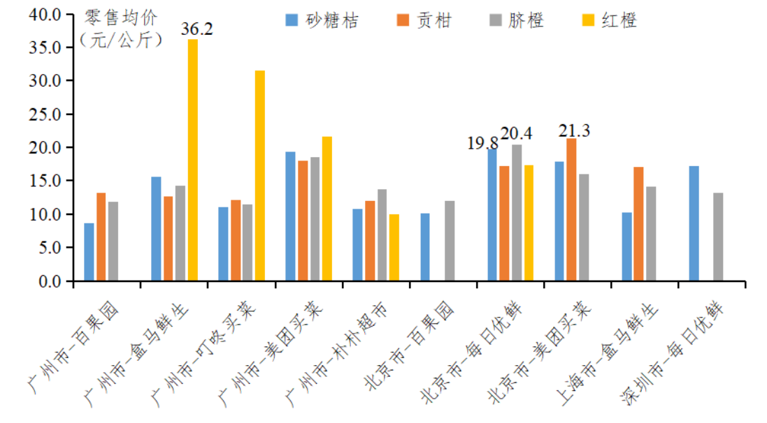 柑橘零售均价平稳。据省农业信息监测体系数据,主要零售平台贡柑、砂糖桔、脐橙和红橙均价分别为15.8元/公斤、17.7元/公斤、14.6元/公斤和20.8元/公斤,其中贡柑均价环比下降3.2%,脐橙均价环比上涨1.0%。