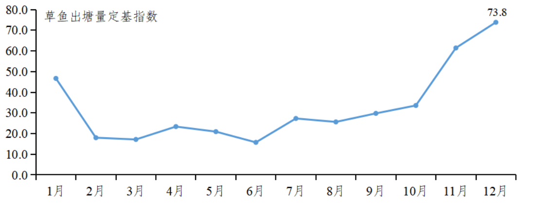 草鱼出塘量增加。养殖基地可供上市草鱼存塘基数大,加之部分基地清塘,拉动草鱼供应量增加。据省农业信息监测体系数据,12月我省监测基地草鱼出塘量环比增加20.2%,出塘量定基指数为73.8,较11月增加12.4,月末草鱼存塘量环比减少3.8%。