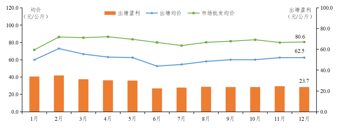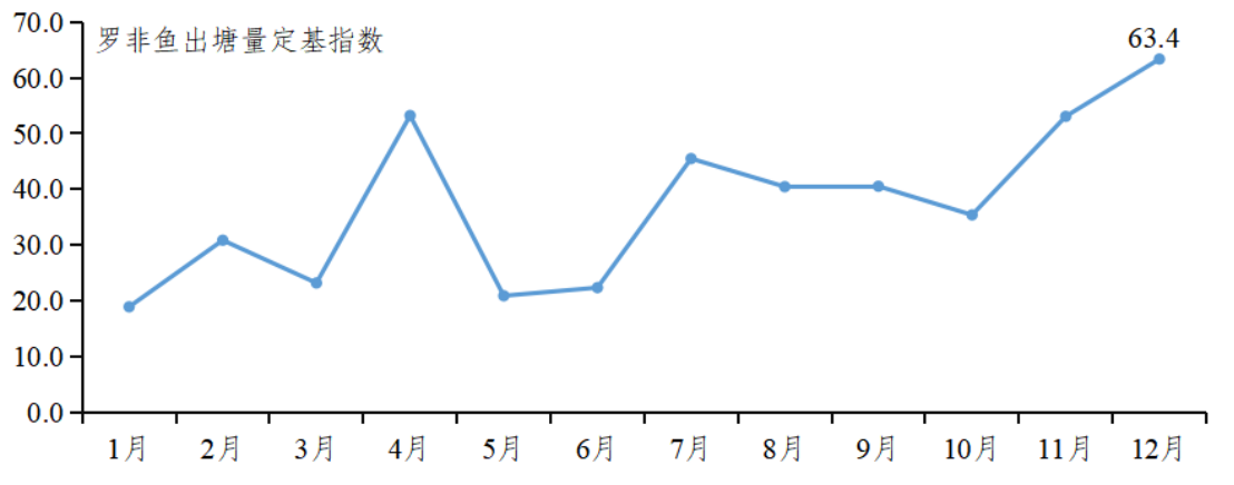 罗非鱼出塘量增加。因加工企业原料收购需求旺盛,叠加气温下降影响,基地加快商品鱼出塘。据省农业信息监测体系数据,12月基地罗非鱼出塘量环比增加19.4%,出塘量定基指数为63.4,较11月增加10.3。在持续高量流通下,基地月末存塘量环比减少7.6%。
