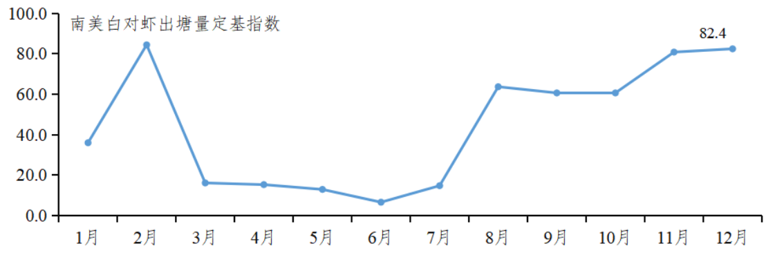 南美白对虾出塘量环比增加。养殖基地为避免降温导致对虾发生应激反应,加快规格对虾出塘。据省农业信息监测体系数据,12月我省南美白对虾基地出塘量环比增加2.0%,出塘量定基指数为82.4,较上月增加2.4,月末存塘量环比减少2.0%。