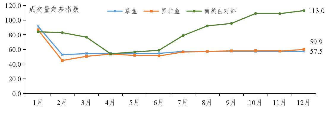 广东主要批发市场草鱼、罗非鱼、南美白对虾成交量定基指数走势图