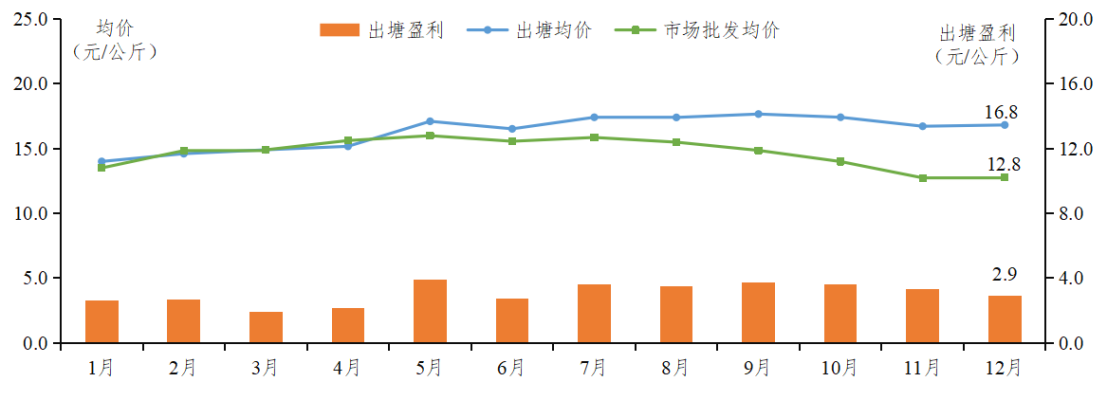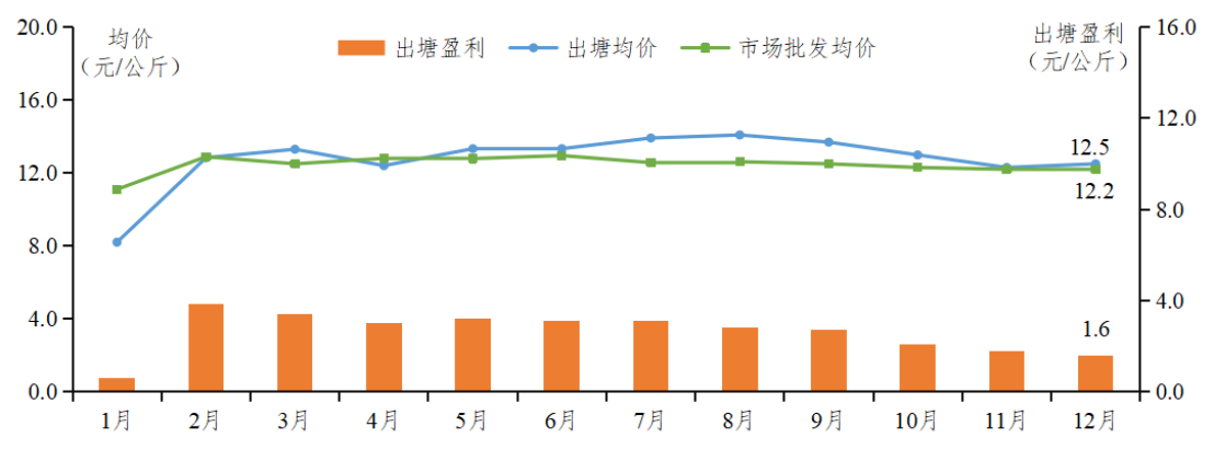 加州鲈鱼价格略降。12月条重0.5公斤以上的加州鲈鱼出塘均价为27.8元/公斤,环比下降0.6%;出塘成本为23.7元/公斤,环比略降0.4%;出塘盈利为4.1元/公斤,环比持平;市场批发均价为29.4元/公斤,环比上涨0.5%。