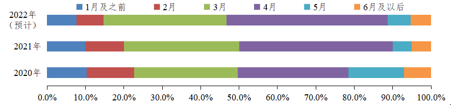 菠萝产量微增,1月上市进度放缓。2022年广东菠萝预计种植面积58.6万亩,生产规模保持稳定。本季菠萝整体生产形势良好,全省菠萝预计产量123.3万吨,同比增长1.1%。其中徐闻菠萝预计产量70万吨(注:总产量后期会有变动,主要受降雨量和耕种管理影响);雷州菠萝预计产量39.9万吨,同比增长3.1%。受国内新冠肺炎疫情散发影响,菠萝上市进度放缓。1月广东菠萝上市进度约7.7%,上市量较去年同期下降22.5%,预计上市高峰期在3-4月,供应较2021年更为集中,销售压力相应增加。
