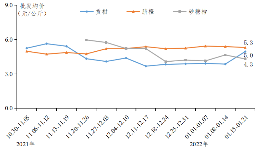 砂糖桔大量上市,贡柑、平远脐橙和廉江红橙收尾。1月天气晴好,气温回暖,各柑橘产区供应顺畅,销售进度平稳。其中年桔1月初正式开采上市,目前已上市约4成;砂糖桔在1月上中旬时期批量上市,而后随着春节的临近,各大学校、企业以及工厂等陆续放假,采购量下降,上市进度放缓,目前已上市约7成;1月下旬贡柑、平远脐橙和廉江红橙上市收尾。