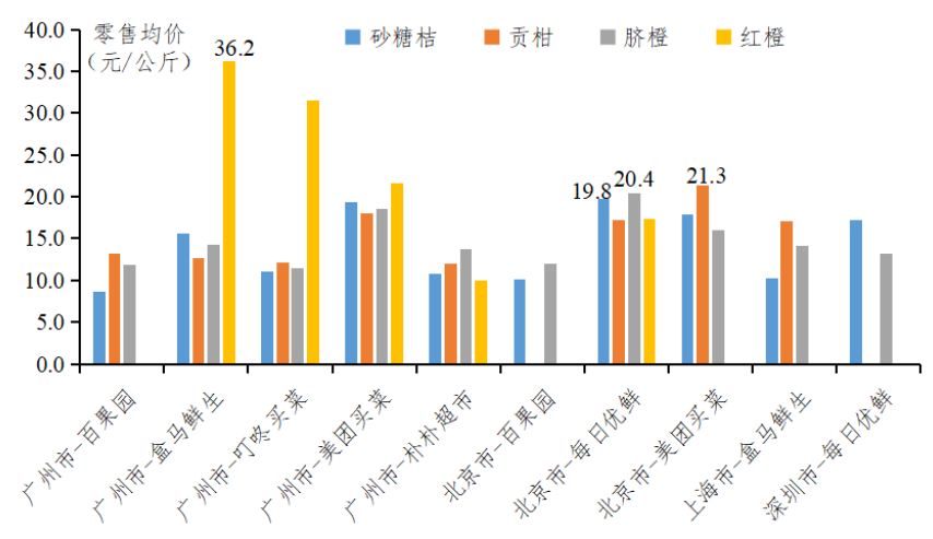 柑橘零售价格涨跌互现。据省农业信息监测体系数据,主要零售平台贡柑、砂糖桔、脐橙和红橙均价分别为15.1元/公斤、14.0元/公斤、14.5元/公斤、25.5元/公斤,其中贡柑均价环比下降5.6%,砂糖桔均价环比下降17.7%,脐橙均价环比持平,红橙均价环比上涨33.7%。