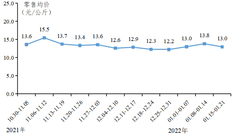 沙田柚零售价格上涨。春节将至,消费者采购年货氛围渐浓,带动沙田柚市场行情上涨。据省农业信息监测体系数据,主要社区零售及商超等平台沙田柚零售均价为13.5元/公斤,环比上涨5.8%。