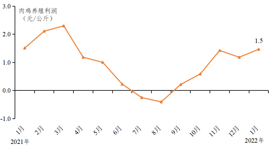 饲料价格居高不下,肉鸡养殖成本和鸡蛋生产成本均稳中有涨。据省农业信息监测体系数据,肉鸡母鸡苗价为3.4元/羽,环比持平;肉鸡养殖成本为17.3元/公斤,环比上涨0.4%;1月平均盈利1.5元/公斤,利润率为7.8%,较上月上升1.4个百分点;其中,中、慢速型肉鸡分别盈利0.8元/公斤和1.8元/公斤。