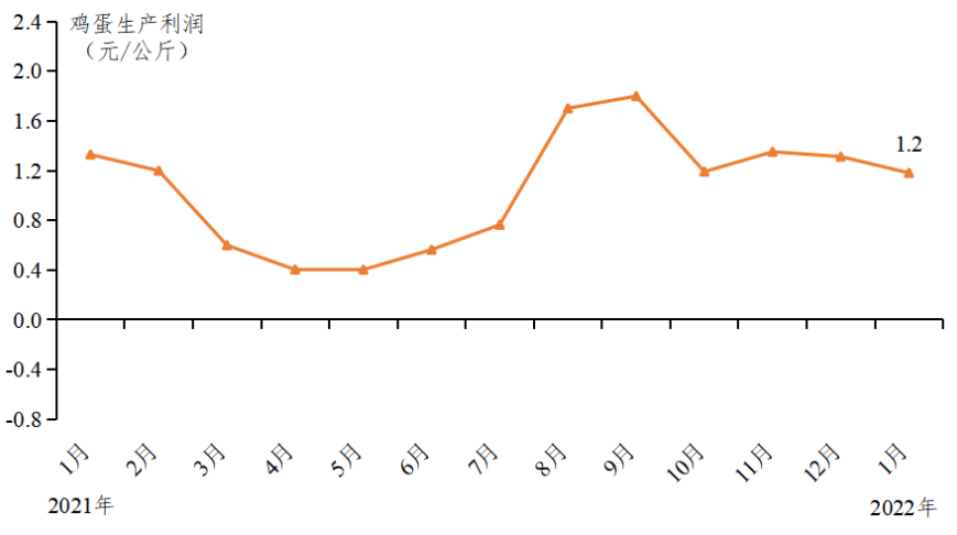蛋鸡鸡苗均价为4.0元/羽,环比持平;鸡蛋生产成本为9.5元/公斤,环比上涨5.8%;1月平均盈利1.2元/公斤,利润率为11.1%,较上月下降1.7个百分点。