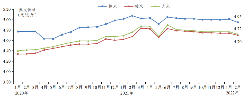 批发市场大米价格环比下跌。据省农业信息监测体系数据,2月大米批发均价为4.72元/公斤,环比下跌1.0%,同比下跌0.9%;其中籼米批发价格为4.70元/公斤,环比下跌0.8%,同比上涨0.5%;粳米批发价格为4.95元/公斤,环比下跌1.2%,同比下跌2.5%。