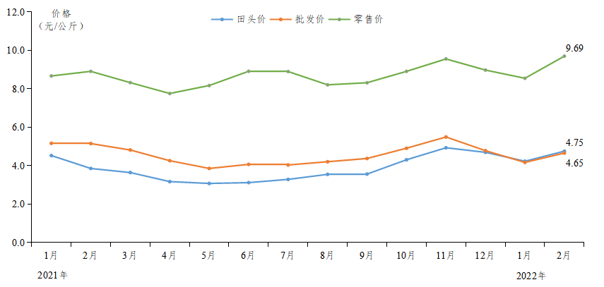 2月受节日效应及不良天气影响,蔬菜价格上涨。据省农业信息监测体系数据,35种大宗蔬菜田头均价为4.75元/公斤,较上月上涨0.52元/公斤,环比上涨12.4%,同比上涨23.4%;批发均价4.65元/公斤,较上月上涨0.49元/公斤,环比上涨11.7%,同比下跌9.6%;零售均价为9.69元/公斤,较上月上涨1.15元/公斤,环比上涨13.5%,同比上涨8.9%。