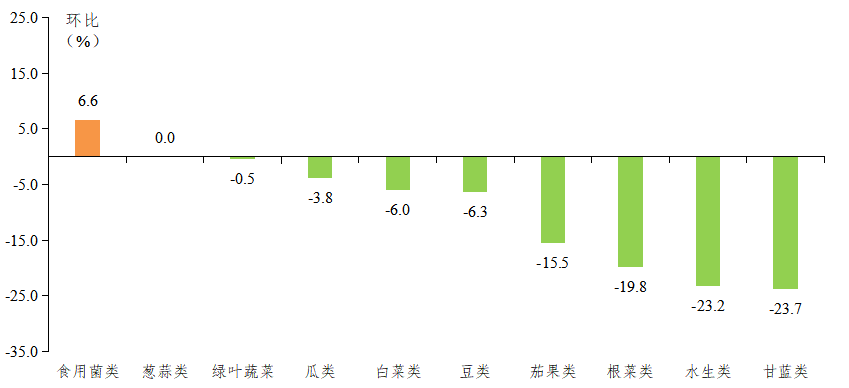 市场食用菌类蔬菜成交量增加,环比增长6.6%。成交量明显减少的是茄果类、根菜类、水生类和甘蓝类,环比下降幅度均在15%以上;瓜类、白菜类和豆类蔬菜成交量小幅减少,环比分别下降3.8%、6.0%和6.3%;绿叶蔬菜和葱蒜类成交量保持稳定。