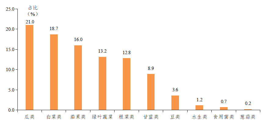 蔬菜产量稳中略增。2月仍是我省冬种蔬菜集中上市期,预计2月我省蔬菜总产量321.7万吨,环比增长0.4%。广东月度鲜菜需求量约150万吨,我省蔬菜供给总体盈余。据省农业信息监测体系数据,茄果类蔬菜产量排第一,产量占比36.3%;其次,白菜类产量占比21.8%;瓜类产量占比14.6%。