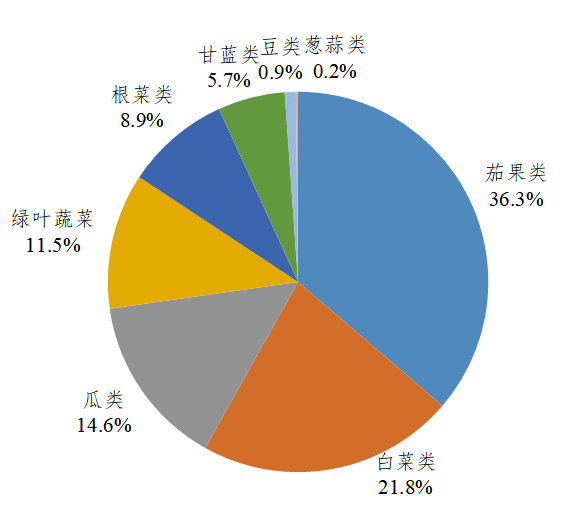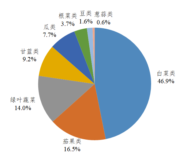 产量排名前三品种分别是辣椒、菜心和胡萝卜,占比分别是15.6%、14.0%和6.5%。