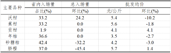 广东主要批发市场柑橘批发价格及成交量环比表