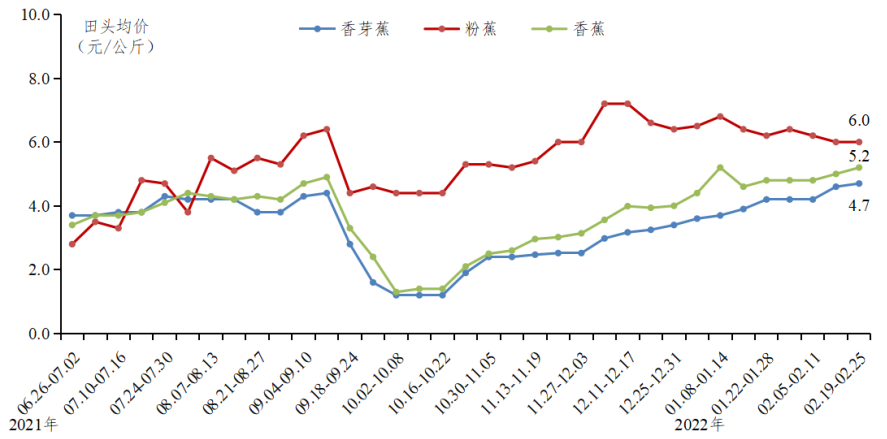 香芽蕉田头均价保持上涨势态。2月天气以阴雨、低温天气为主,香蕉出货缓慢,供应量较少,香芽蕉行情保持上涨势态。据省农业信息监测体系数据,规模化基地香蕉田头均价为4.9元/公斤,其中香芽蕉田头均价为4.4元/公斤,环比上涨14.9%;粉蕉田头均价为6.1元/公斤,环比下降5.5%。
