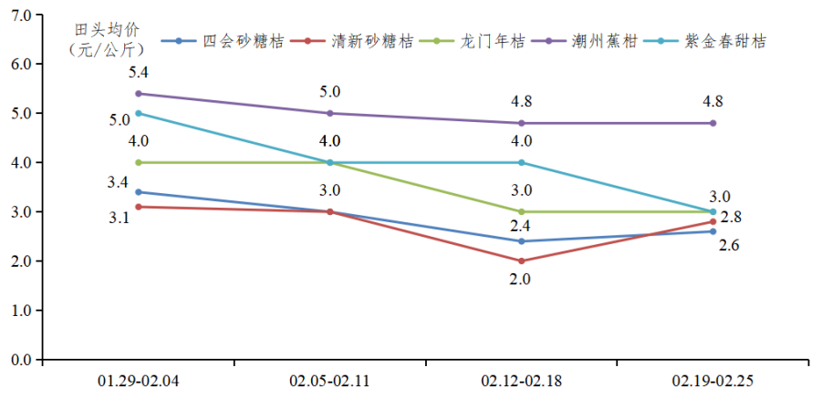 柑橘上市收尾,行情涨跌起伏明显。2月初正逢新春佳节,各品类柑橘田头价格理想,2月中下旬阴雨连绵影响品质,加之市场需求回落,田头价格跌幅明显。据省农业信息监测体系数据,全省规模化柑橘生产基地柑橘田头均价为3.6元/公斤。其中,砂糖桔田头均价为2.8元/公斤,环比下降22.2%;年桔田头均价为3.0元/公斤,环比下降16.7%;蕉柑田头均价5.0元/公斤,环比下降3.9%。