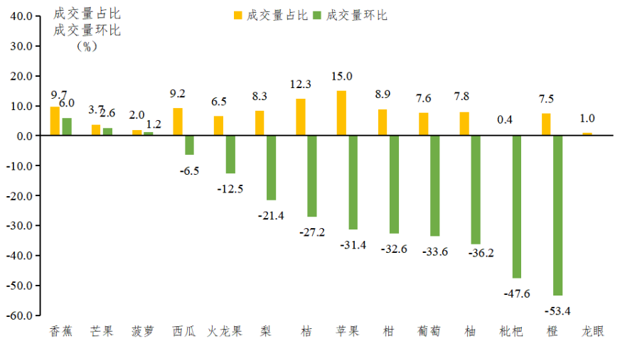 批发市场水果成交量以降为主。据省农业信息监测体系数据,省内批发市场水果总成交量环比下降25.2%,主要批发市场成交量排名前三的水果是苹果、桔、香蕉,占比分别为15.0%、12.3%和9.7%;成交量环比增加的水果为香蕉、芒果、菠萝,环比分别增加6.0%、2.6%、1.2%;成交量环比降幅较大的水果是橙、枇杷和柚,环比分别下降53.4%、47.6%和36.2%。