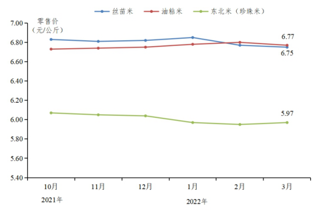 大米零售价格整体平稳。据地级市“米袋子”数据,第一季度农贸市场大米价格6.42元/公斤,环比下降0.2%,其中丝苗米价格为6.80元/公斤,环比下降0.3%,油粘米价格为6.78元/公斤,环比上涨0.4%,珍珠米(东北米)价格为5.96元/公斤,环比下降1.5%。