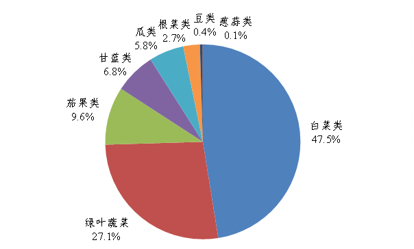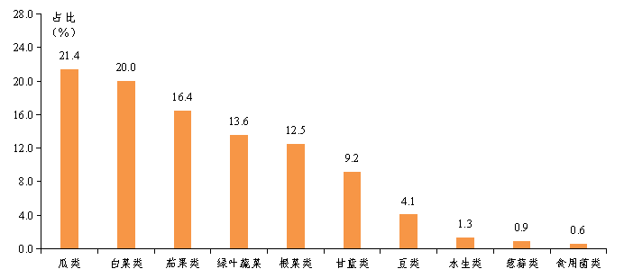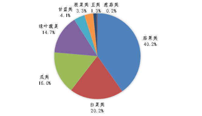 其中菜心、小白菜和空心菜在田面积较多,占比分别是30.9%、11.0%和10.4%。
