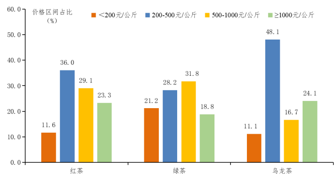 茶叶价格同比偏低。第一季度春节期间销售总体稳定,行情平稳,但春茶少量上市,价格与去年同期下降,总体价格下降。据省农业信息监测体系数据,第一季度广东茶叶规模基地红茶、绿茶和乌龙茶的销售均价分别为337.9元/公斤、295.1元/公斤和506.4元/公斤,同比分别降低17.2%、18.5%和2.9%;红茶和乌龙茶的销售价格均以200-500元/公斤的区间占比最高,占比分别达36.0%和48.1%,绿茶销售价格以500-1000元/公斤的区间占比最高,为31.8%。
