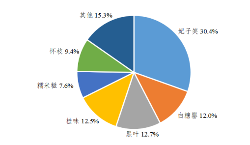 荔枝产量下降。2022年荔枝生长期受年初低温天气影响,各品种成花率和坐果率有一定程度下降,妃子笑和桂味影响较大,总体产量仍然保持较高水平,全省荔枝产量较去年同期预计减产至130万吨,同比下降13.9%。主要品种方面,妃子笑、桂味、黑叶居前三,分别占比30%、13%、13%。