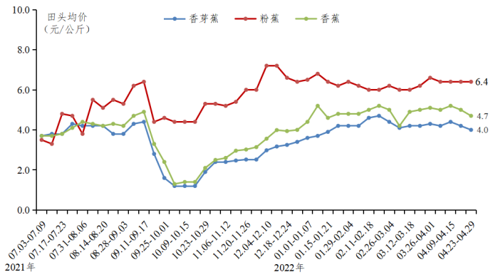 香蕉田头均价整体上涨。据省农业信息监测体系数据,规模基地香蕉田头均价为5.0元/公斤,环比上涨4.2%,其中粉蕉田头均价为6.4元/公斤,环比上涨3.9%,香芽蕉田头均价为4.2元/公斤,环比下降1.9%。