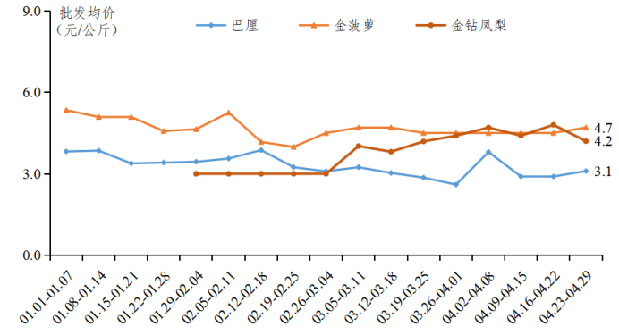 菠萝批发价整体上涨,省外价格下降。菠萝价格整体小幅波动,仅金砖凤梨价格上涨,巴厘批发均价为3.1元/公斤,环比持平,金菠萝批发均价4.5元/公斤,环比下降1.9%,金钻凤梨批发均价4.5元/公斤,环比上涨19.8%。省外主要批发市场受疫情影响,价格下降,菠萝均价为5.0元/公斤,环比下降3.8%。