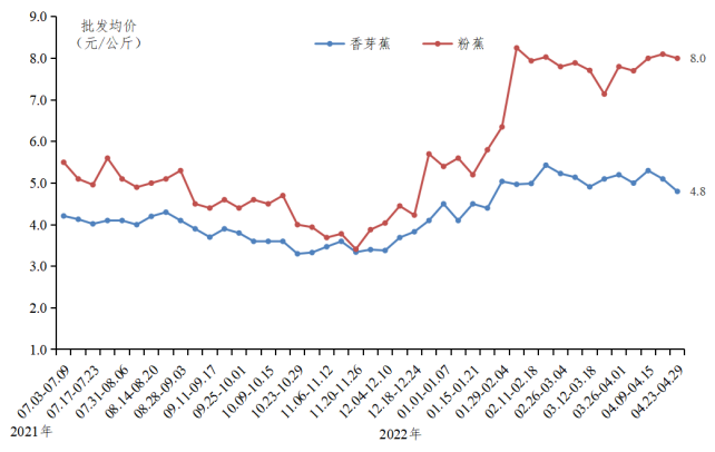 香蕉批发价格总体上涨。香蕉批发价格5.5元/公斤,环比上涨0.4%,香芽蕉批发均价为5.1元/公斤,环比持平,粉蕉批发均价7.7元/公斤,环比上涨2.9%。省外主要批发市场香蕉均价为6.3元/公斤,环比上涨3.3%。