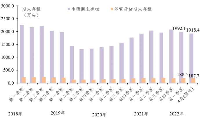生猪存栏环比下降。据省农业信息监测体系数据,规模基地生猪存栏环比下降3.7%,同比增长1.3%,能繁母猪存栏环比下降0.8%,同比下降1.9%。预估4月末我省生猪存栏降至1918.4万头,其中能繁母猪存栏为187.7万头,达到农业农村部划定的正常保有量的98.8%,为正常波动区间。