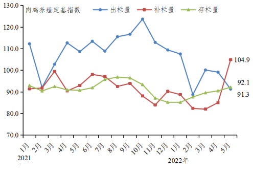 广东规模基地肉鸡存栏、出栏、补栏定基指数走势图
