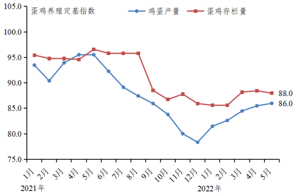 广东规模基地蛋鸡存栏量和鸡蛋产量定基指数走势图