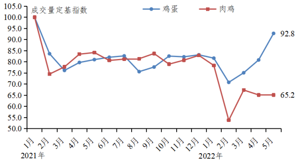 广东主要批发市场肉鸡、鸡蛋成交量定基指数走势图