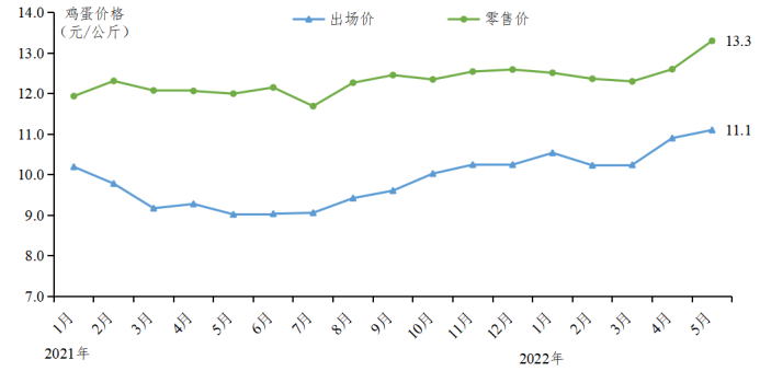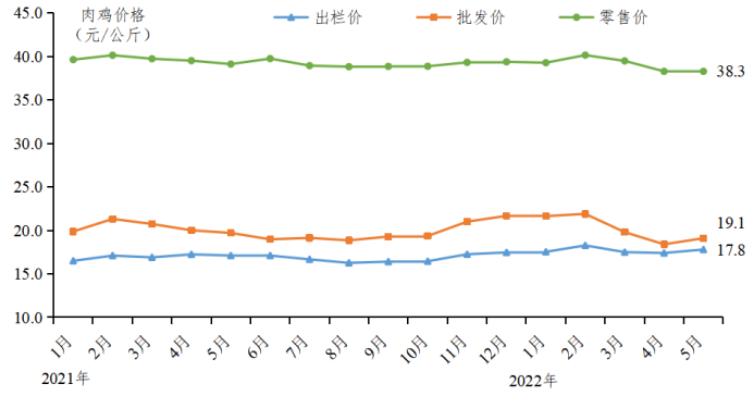 肉鸡价格上涨。5月在供应减少及猪价上涨带来的替代性消费增加影响下,肉鸡价格上涨。据省农业信息监测体系数据,肉鸡出栏价为17.8元/公斤,环比上涨2.3%,批发价为19.1元/公斤,环比上涨3.8%。据地市“菜篮子”数据,白条鸡零售价为38.3元/公斤,环比持平%。