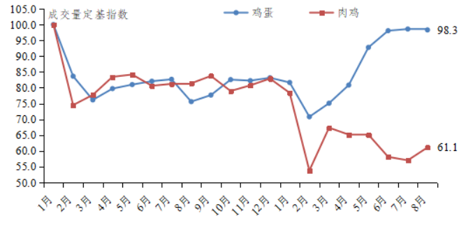 广东主要批发市场肉鸡、鸡蛋成交量定基指数走势图