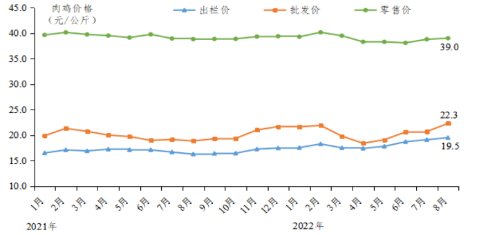 肉鸡价格整体平稳。8月肉鸡出栏价和零售价相对平稳,批发价小幅上涨。据省农业信息监测体系数据,肉鸡出栏价为19.5元/公斤,环比上涨2%,批发价为22.3元/公斤,环比上涨8%。白条鸡零售价为39元/公斤,环比持平。