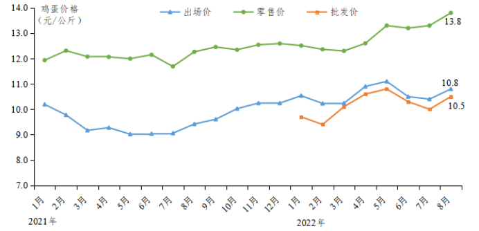 蛋价上涨。8月鸡蛋价格呈上涨趋势,鸡蛋出场价为10.8元/公斤,环比上涨4%;市场批发价10.5元/公斤,环比上涨4%。鸡蛋零售价为13.8元/公斤,环比上涨4%。