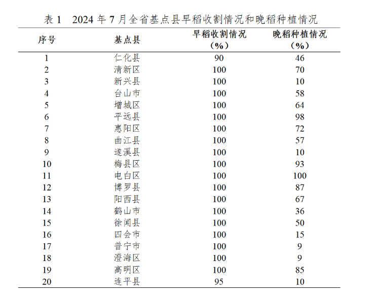 7月份全省20个基点县早稻已基本收割完毕,各地正在陆续开展晚稻种植。