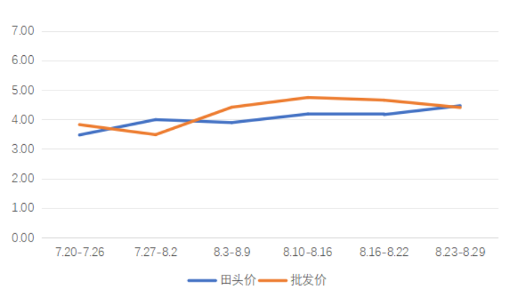 根据省农业信息综合监测体系数据,8月我省规模基地主种蔬菜田头均价为4.13元/公斤,环比上涨15.25%;大型批发市场8月主要监测品种蔬菜批发均价为4.37元/公斤,同比上涨32.42%,环比上涨22.41%。重点监测的大宗蔬菜单品中,田头均价涨幅排名前三的为黄瓜、南瓜、丝瓜,环比分别上涨29.8%、26.5%、18.65%;批发均价涨幅排名前三的为白萝卜、冬瓜、大白菜,均价分别为2.48元/公斤、2.30元/公斤、2.74元/公斤。