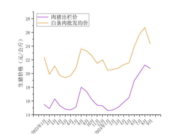 9月生猪出栏均价出现小幅下跌,为20.24元/公斤,环比下降4.74%,同比上涨19.20%。9月白条肉批发均价为24.35元/公斤,环比下跌8.87%,同比上涨20.94%。