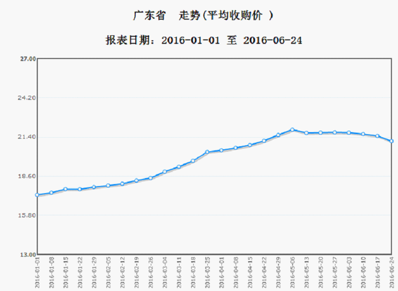 据对全省101家规模以上生猪定点屠宰样本企业监测统计,2016年6月20-26日,生猪平均收购价格为21.10元/公斤,较前一周下降1.77%,较去年同期上涨34.91%。本周较上周环比降幅较大的地区有汕头市9.09%,梅州市2.93%,潮州市2.78%。