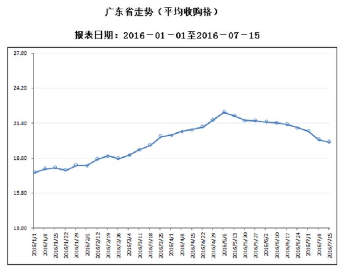 据对全省53家规模以上生猪定点屠宰样本企业监测统计,2016年7月11-7月17日,生猪平均收购价格为19.88元/公斤,较前一周下降1%,较去年同期上涨11.81%。本周较上周环比降幅较大的地区有珠海市6.25%,梅州市3.68%,深圳市2.99%。