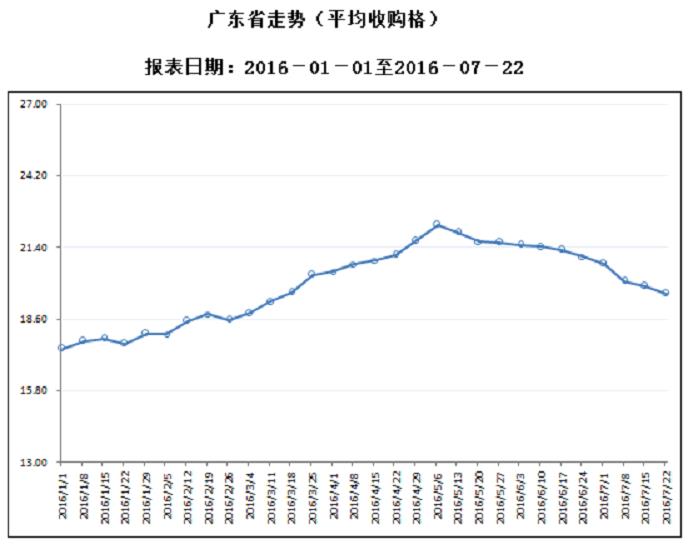 据对全省53家规模以上生猪定点屠宰样本企业监测统计,2016年7月18-7月24日,生猪平均收购价格为19.6元/公斤,较前一周下降1.41%,较去年同期上涨5.38%。本周较上周环比降幅较大的地区有惠州市3.13%,茂名市2.91%,顺德区2.62%。